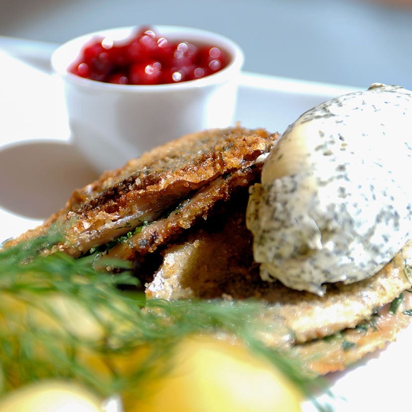 med varmrökt lax, räkor, majonnäs, dill och pepparrot