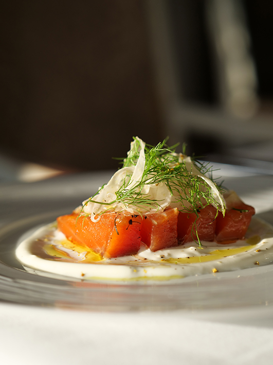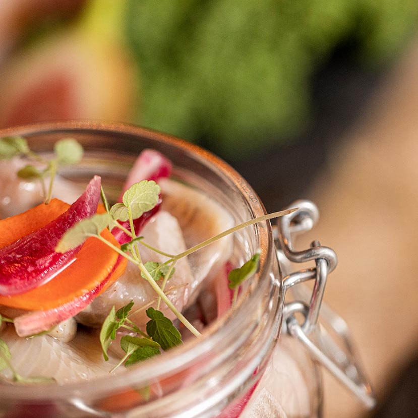 regnbågslax med svensk misomajonnäs och borretanalökar med ponzu och friterat rispapper